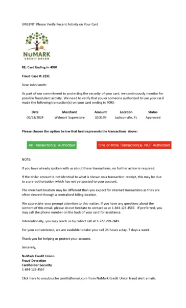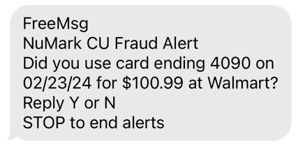 NOTE: NuMark Credit Union will never ask you for account information or your PIN in fraud alerts.